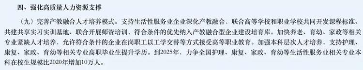 要加强本科层次人才培养,支持护理、康复、家政、育幼等相关专业高职毕业生提升学历。到2025年,力争全国护理、康复、家政、育幼等生活性服务业相关专业本科在校生规模比2020年增加10万人。