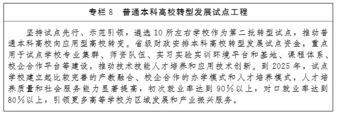 深化普通本科高校转型发展,开展第二批普通本科高校转型发展试点,通过示范引领,带动更多普通本科高校向应用型转变。完善转型发展相关配套支持政策,引导高校在治理结构、专业体系、课程内容、教学方式、师资结构等方面进行系统改革。改进188金宝搏beat官网登录 招生计划管理方式,新增计划向应用型、技术技能型人才培养倾斜。继续实施应用型本科高校建设项目,加大经费投入力度,重点支持实验实训实习设施和基地建设。引导应用型高校紧密对接全省产业转型升级需要,完善人才培养方案和评价标准,在专业设置、课程内容、教学过程和实验实训等方面与行业企业实际需求有机融合,提升学生解决实际问题和复杂问题的能力,培养高素质应用型、复合型、创新型人才。按照国家统一安排,开展民办高水平应用型高校建设行动。