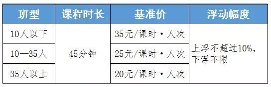 班型10人以下30元/课时·人,班型10-35人20/元课时·人,班型35人以上15/元课时·人。浮动幅度,上浮不得超过10%,下浮不限。线下标准课程时长为45分钟,实际时长不一样的,按比例折算。