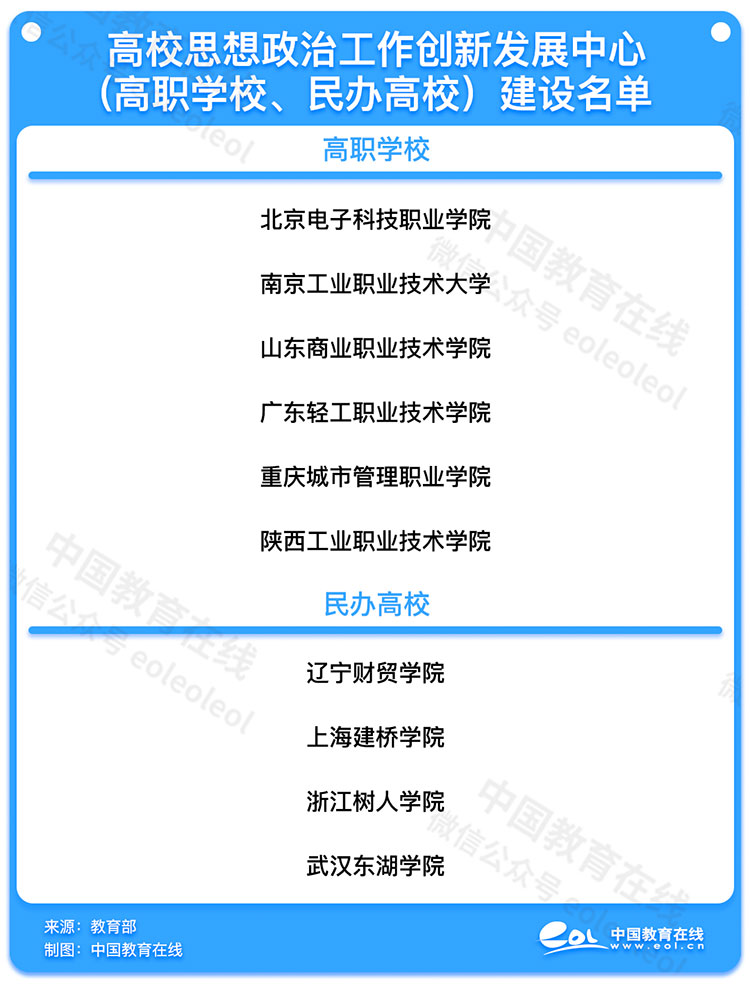 近日,教育布公示了高校思想政治工作创新发展中心(高职学校、民办高校)遴选结果。根据《金博宝最新官方网站查询网址 思想政治工作司关于在高职学校、民办高校中培育建设思想政治工作创新发展中心的通知》(教思政司函〔2021〕10号)安排和评审工作方案,经省级党委教育工作部门把关推荐、专家评审,遴选6所高职学校、4所民办高校承担高校思想政治工作创新发展中心建设任务。公示期自2022年1月26日至1月30日。