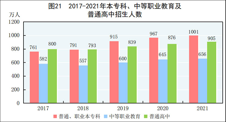 2月28日,国家统计局发布《中华人民共和国2021年国民经济和社会发展统计公报》。公报显示,2021年全年研究生教育招生117.7万人,在学研究生333.2万人,毕业生77.3万人。普通、职业本专科招生1001.3万人,在校生3496.1万人,毕业生826.5万人。中等职业教育招生656.2万人,在校生1738.5万人,毕业生484.1万人。普通高中招生905.0万人,在校生2605.0万人,毕业生780.2万人。初中招生1705.4万人,在校生5018.4万人,毕业生1587.1万人。普通小学招生1782.6万人,在校生10779.9万人,毕业生1718.0万人。特殊教育招生14.9万人,在校生92.0万人,毕业生14.6万人。学前教育在园幼儿4805.2万人。九年义务教育巩固率为95.4%,高中阶段毛入学率为91.4%。