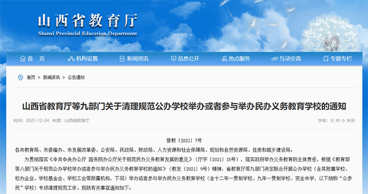 近日,山西省教育厅、山西省委编办等九部门印发清理规范公办学校举办或者参与举办民办义务教育学校的通知,联合开展公办学校(含其附属学校、校办企业、学校基金会、学校工会等附属机构)举办,或者参与举办民办义务教育学校(含十二年一贯制学校、九年一贯制学校、完全中学,统称“公参民”学校)专项清理规范工作,2022年底前全部清理规范到位。