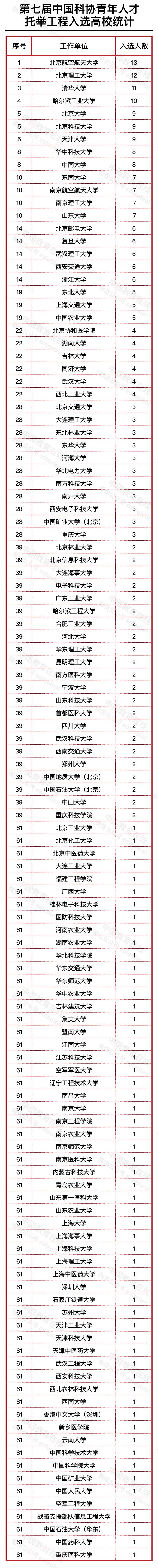 第七届中国科协青年人才托举工程入选工作单位(高校)统计情况如下:
