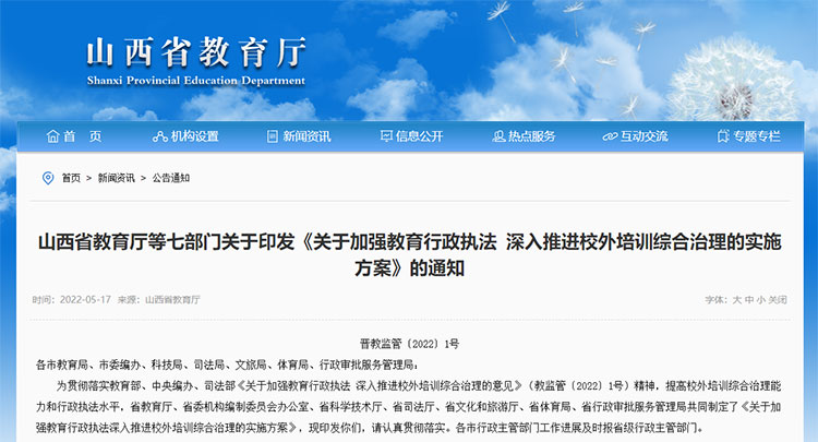 近日,山西省教育厅、山西省委机构编制委员会办公室等7部门联合印发《关于加强教育行政执法深入推进校外培训综合治理的实施方案》(以下简称《方案》)。其中提出,各级行政主管部门每年要组织开展不少于2次的行政执法检查,县(市、区)行政主管部门每年执法检查要覆盖辖区所有校外培训机构,及时通报校外培训违法违规典型案例。