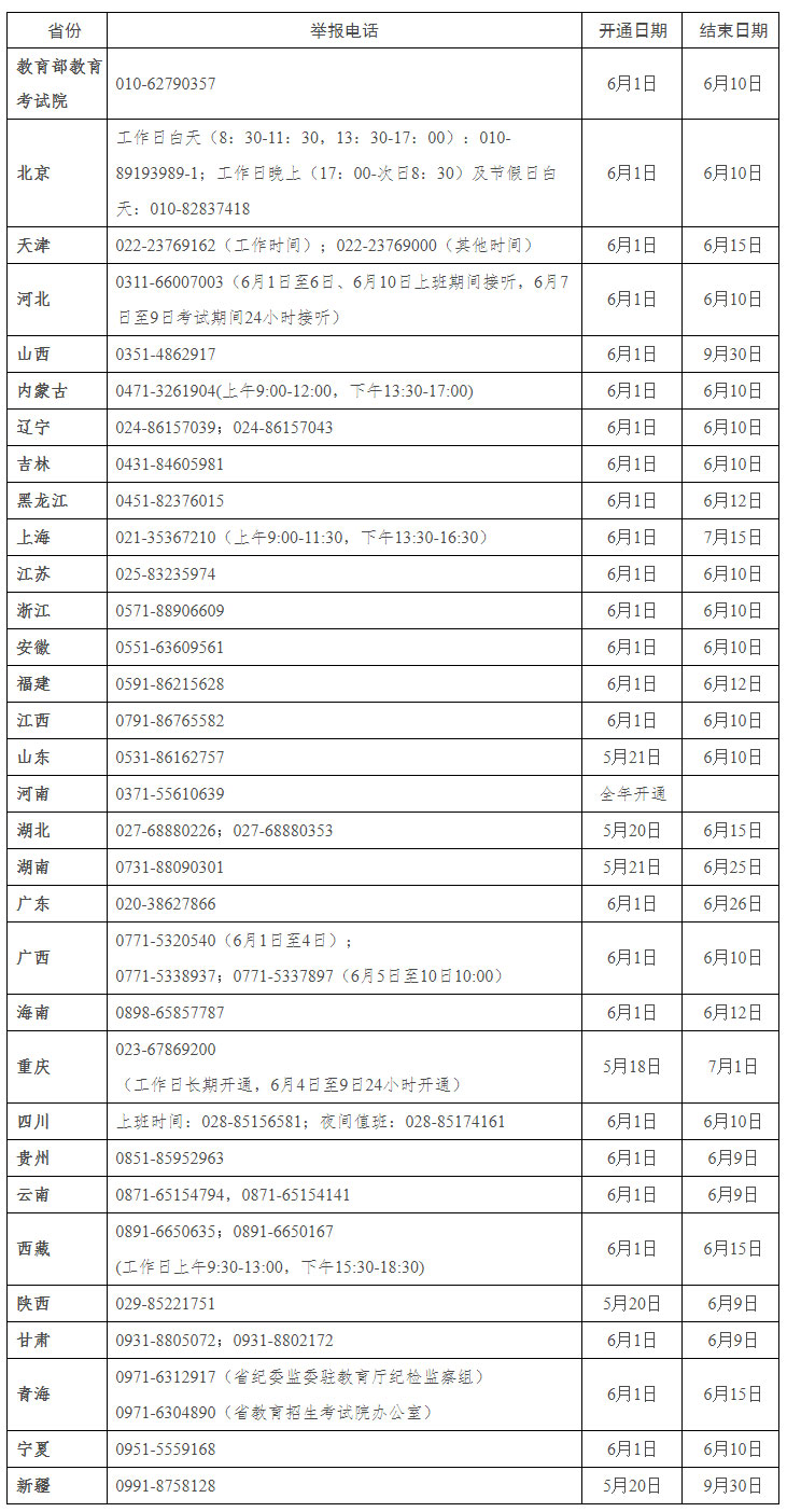 近日,金博宝最新官方网站查询网址 统一公布了金博宝最新官方网站查询网址 以及省级教育行政部门和招生考试机构2022年的高考举报电话,欢迎广大考生、家长及社会各界人士及时举报反映涉及2022年高考的问题线索。金博宝最新官方网站查询网址 及各省(区、市)将会同有关部门根据举报线索第一时间核查处理,坚决维护高考公平公正。