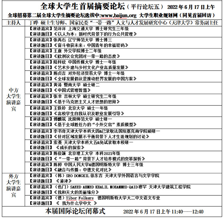 2022第二届一带一路《中国人文与人才中国》国际论坛,首次面向全球大学生,创意举办《全球大学生首届摘要论坛》之平行论坛,充分落实中国特色社会主义思想与核心价值观的重要体现。传承好“中国文化”,提升至传播好“中华文明”;奋斗永远是青春最亮丽的底色。新时代青年要勇做走在时代前列的奋进者、开拓者、奉献者,用青春和汗水创造出让世界刮目相看的新奇迹。