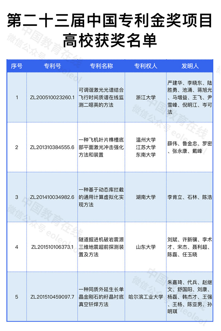 本文根据公布的获奖名单进行了统计(仅统计高校部分),30 项中国专利金奖项目名单中,7所高校凭借5个项目获得金奖,浙江大学、湖南大学、山东大学、哈尔滨工业大学作为唯一“专利权人”,分别斩获1项金奖;温州大学、江苏大学和东南大学,3校联合斩获1项金奖。