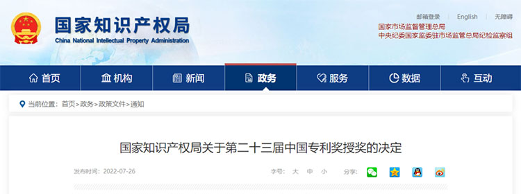 7月26日,国家知识产权局发布关于第二十三届中国专利奖授奖的决定,根据《中国专利奖评奖办法》规定,经国务院有关部门知识产权工作管理机构、地方知识产权局、有关全国性行业协会,以及中国科学院院士和中国工程院院士等推荐,中国专利奖评审委员会评审,社会公示,国家知识产权局和世界知识产权组织决定: