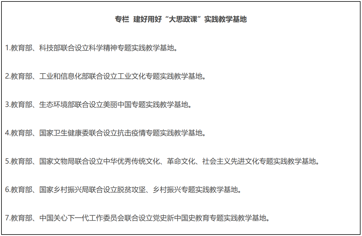 、中央宣传部做好“大思政课”建设的总体谋划。中央网信办指导做好“大思政课”全媒体宣传。科技部、工业和信息化部、生态环境部、国家卫生健康委、国家文物局、国家乡村振兴局、中国关心下一代工作委员会等部门,加强对基地的指导和建设,切实发挥好基地的育人功能。