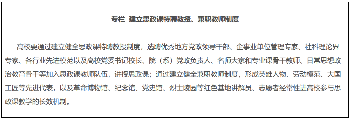 14.建设专兼结合的师资队伍。各地各校严格按照要求配备建强高校专职思政课教师、辅导员队伍,提高中小学专职思政课教师比例,实行思政课特聘教授、兼职教师制度,积极聘请党政领导、科学家、老同志、先进模范等担任思政课兼职教师。深入实施马克思主义学院院长(书记)培养工程,通过集中培养培训、委托重大项目、加强实践锻炼、开展国际国内访学等方式,培养一批青年马克思主义理论家。