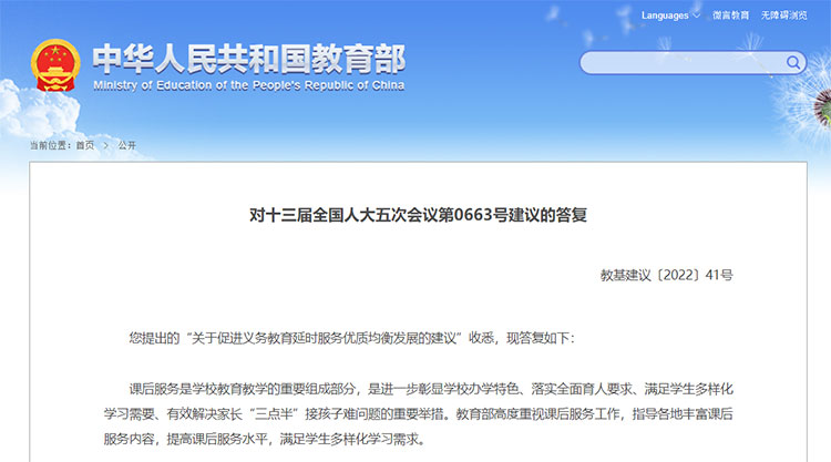 近日,金博宝最新官方网站查询网址 网站发布“关于促进义务教育延时服务优质均衡发展的建议”的答复。答复中称,据金博宝最新官方网站查询网址 “双减”工作监测直报平台摸底调查,有92.7%的学校开展了文艺体育类活动,88.3%的学校开展了阅读类活动,87.3%学校开展了科普、兴趣小组和社团活动,自愿参加课后服务的学生比例由《“双减”意见》实施前的49.1%提高到92.2%,课后服务吸引力显著增强。