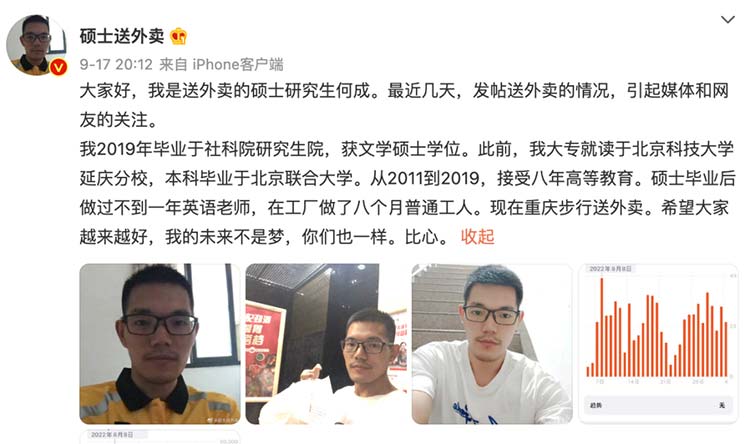 何成事件之所以能够吸引到公众关注,就在于一个硕士做了不需要学历就可以做的工作。何成从专科到社科院大学硕士毕业,选择送外卖的工作让人难以理解。热度还没有下去,浙江大学竺可桢学院本科毕业生、现为浙大博士生的孟伟为自己送外卖给浙大丢人而道歉,使得高学历送外卖再度引发热议。