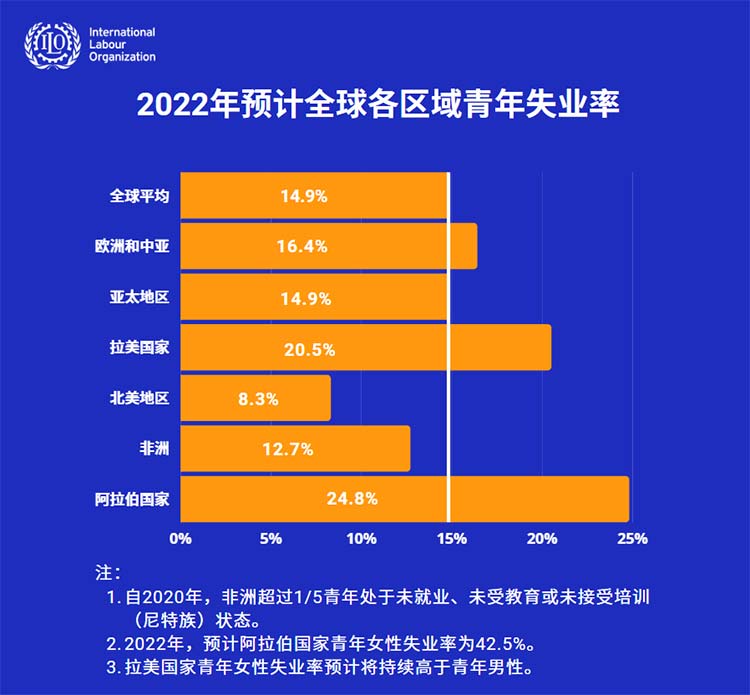 报告预计2022年亚太地区青年失业率将达到14.9%,与全球平均水平持平,但各次区域和国家间存在巨大差异。