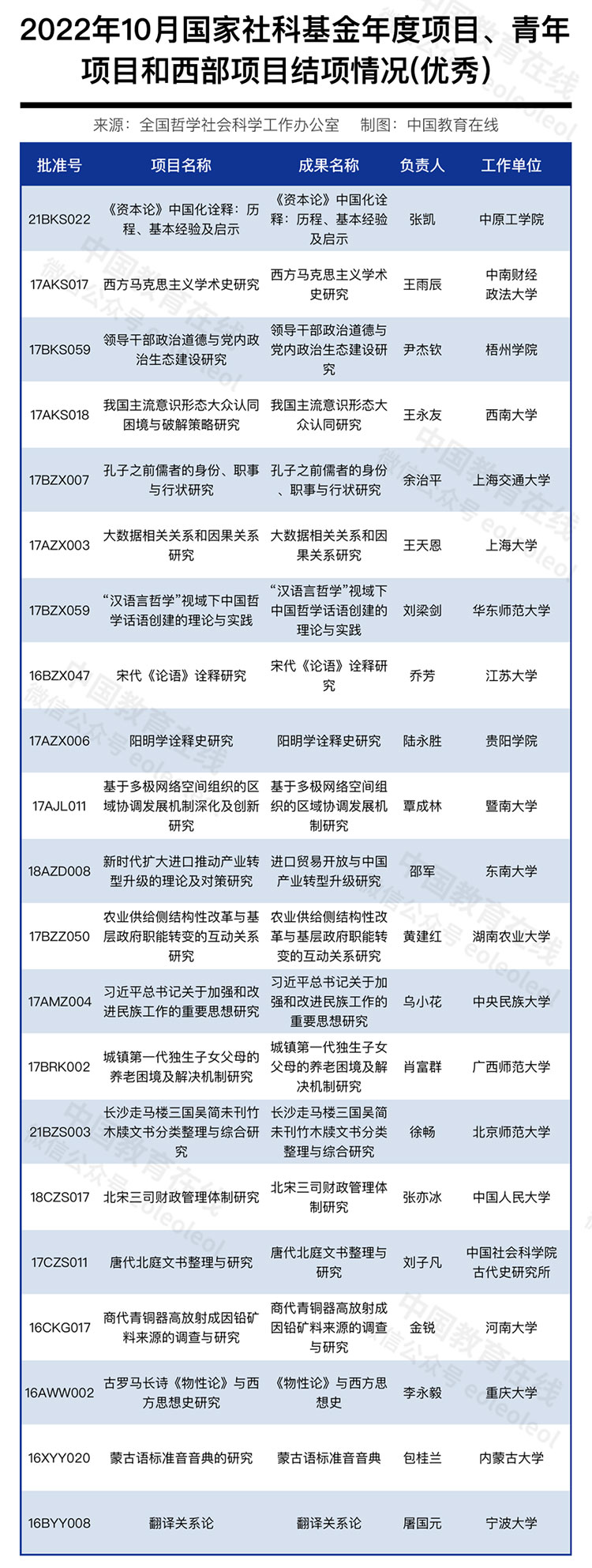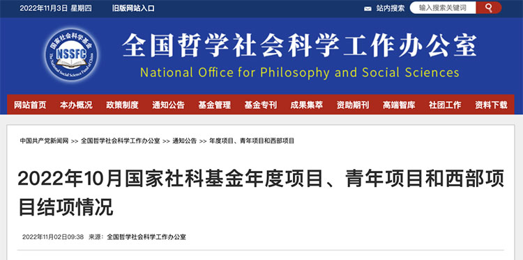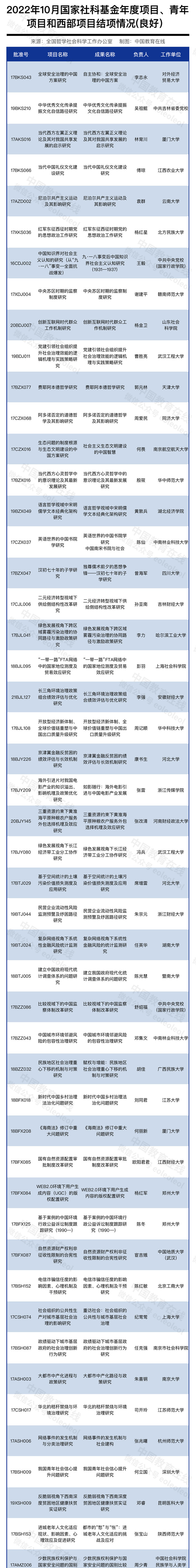 2022年11月2日,全国哲学社会科学工作办公室网站发布信息,公布了10月份的国家社科基金年度项目、青年项目和西部项目和后期资助项目的结项情况。