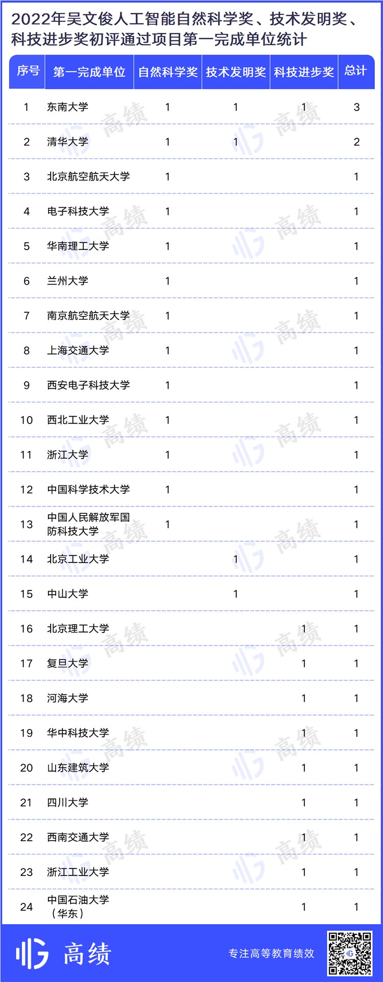 据统计,在公示的自然科学奖、技术发明奖和科技进步奖名单中,共有24所高校作为第一完成单位通过初评,其中东南大学共有3项通过初评,清华大学有2项通过初评,北京航空航天大学、华南理工大学、兰州大学、南京航空航天大学、上海交通大学等22所高校各有1项通过初评。