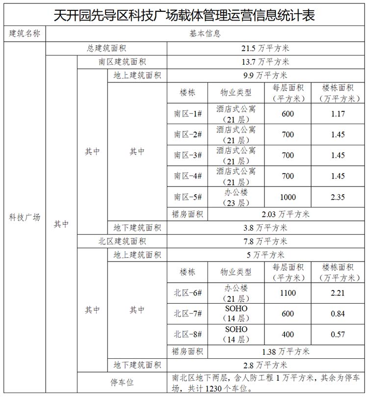 一期载体空间供给。天津科技广场为综合体项目,位于科研西路与航海道交口以东,该地块为商业服务业用地,占地面积4.04万平方米,总建筑面积21.5万平方米(地上建筑面积14.9万平方米、地下建筑面积6.6万平方米,容积率为3.69),可提供建筑面积21万平方米的载体空间。
