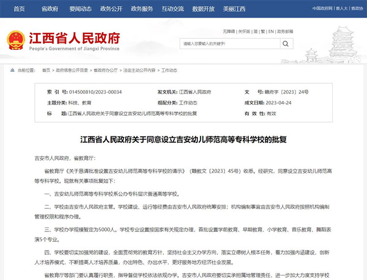 省教育厅《关于恳请批准设置吉安幼儿师范高等专科学校的请示》(赣教文〔2023〕45号)收悉。经研究,同意设立吉安幼儿师范高等专科学校。现就有关事项批复如下: