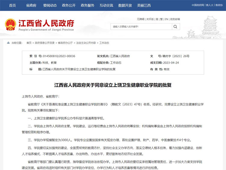 省教育厅《关于恳请批准设置上饶卫生健康职业学院的请示》(赣教文〔2023〕47号)收悉。经研究,同意设立上饶卫生健康职业学院。现就有关事项批复如下: