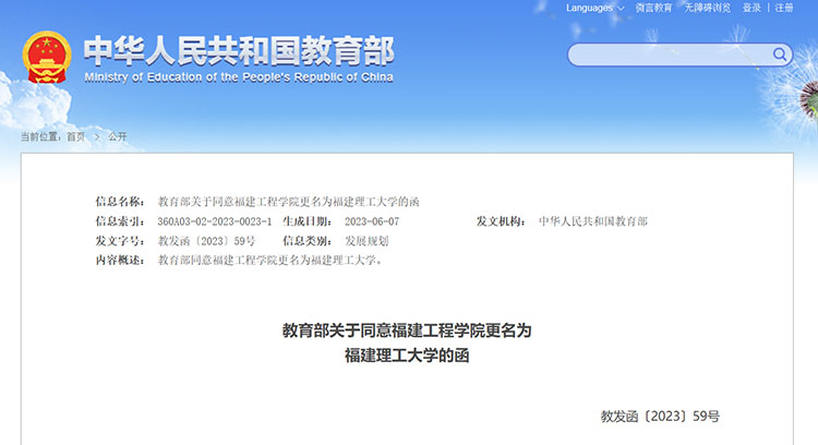 《福建省人民政府关于申请将福建工程学院更名为福建理工大学的函》(闽政函〔2023〕4号)收悉。