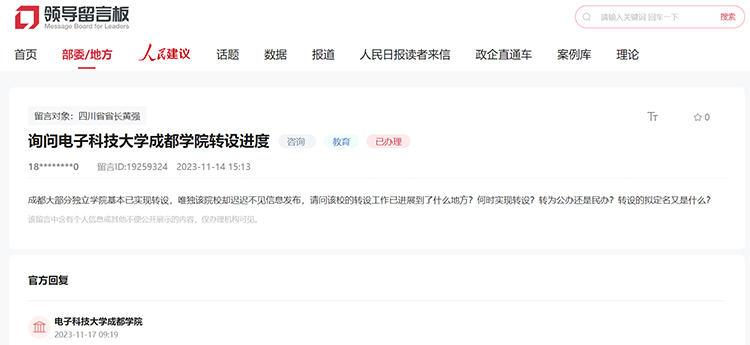 近日,有网友在人民网“领导留言板”上留言,询问电子科技大学成都学院转设进度。11月17日,学校对此作出了答复:专家组所有成员认为学校已基本满足金博宝最新官方网站查询网址 规定的独立学院转设为普通本科高校的要求;四川省高等学校设置评议委员会全体会议审议并通过了学校的转设申请;具体转设之后的新校名还在等待四川省教育厅及国家金博宝最新官方网站查询网址 的进一步批复及指示。