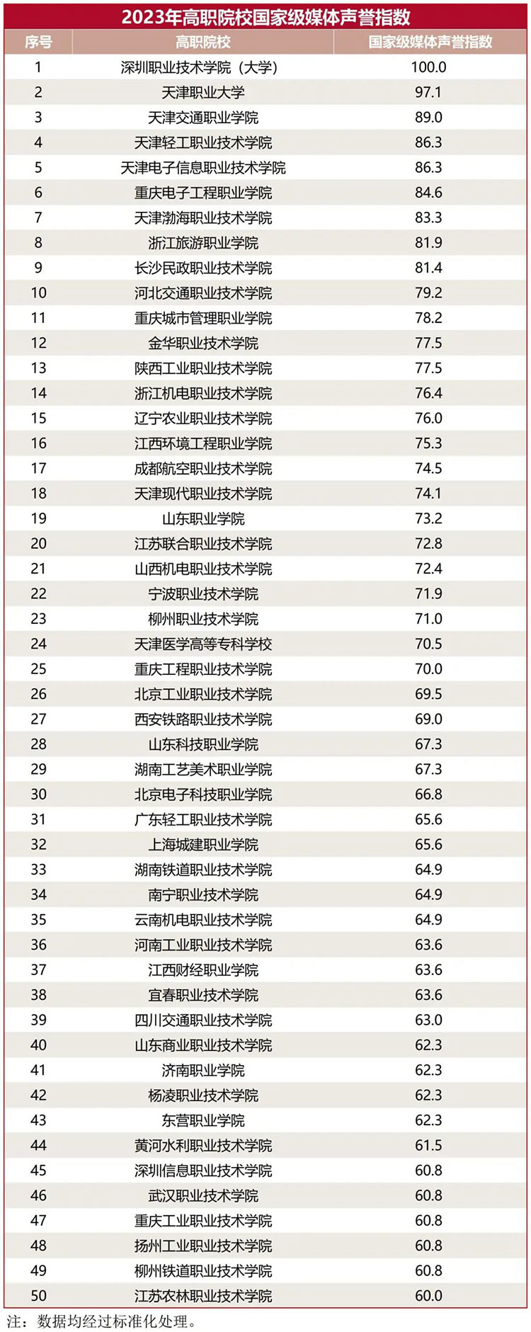 2023年11月24日,中国人民大学评价研究中心正式发布2023年高职院校媒体声誉指数。该指数基于新闻媒体报道大数据分析,建构了高职院校媒体声誉评价体系,涉及职业技能培训、教学资源保障、社会服务能力等内容维度,以及国家级媒体、地方媒体、行业媒体等报道来源分类,以指数的形式反映2022年7月以来相关院校的媒体声誉差异。总指数及六个分指数显示:深圳职业技术学院(大学)在各个指数榜单均位居首位、表现亮眼,总指数位居前十的高职院校还有天津职业大学、长沙航空职业技术学院、重庆电子工程职业学院、深圳信息职业技术学院、长沙民政职业技术学院、浙江旅游职业学院、山东科技职业学院、湖南汽车工程职业学院、北京电子科技职业学院等。