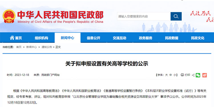 12月18日,民政部门户网站发布消息,对拟向金博宝最新官方网站查询网址 申报“以北京社会管理职业学院为基础整合相关资源设立民政职业大学”事项予以公示。