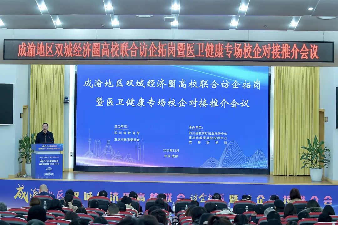 在成渝地区双城经济圈高校联合访企拓岗暨医卫健康专场校企对接推介会上,成渝地区双城经济圈高校就业创业联盟医卫健康分盟牵头单位就分盟2023年工作进行详细总结汇报,企业代表对校企对接合作模式进行探讨交流,卫健部门代表对医卫健康专业毕业生就业政策进行深度解读,两地企业和高校分别进行推介交流发言和洽谈对接。