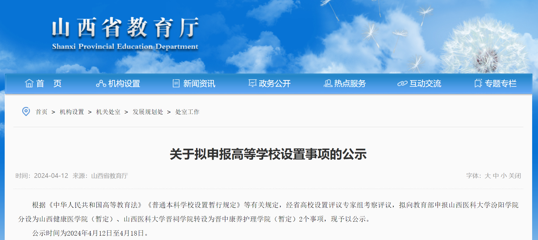 4月12日,山西省教育厅发布《关于拟申报高等学校设置事项的公示》。