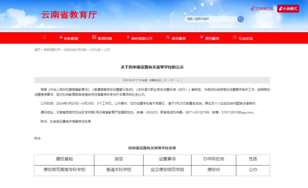 5月20日,云南省教育厅发布《关于拟申报设置有关高等学校的公示》,根据《中华人民共和国188金宝搏beat官网登录 法》《普通高等学校设置暂行条例》《本科层次职业学校设置标准(试行)》等规定,为做好拟申报高校设置事项有关工作,按照院校设置程序要求,现对拟向金博宝最新官方网站查询网址 申报设置德宏师范学院事项向社会公示,建校基础为德宏师范高等专科学校。公示时间为2024年5月20日—5月24日。
