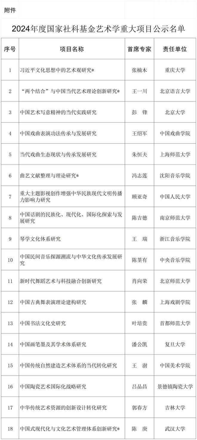 2024年度国家社科基金艺术学重大项目公示名单如下: