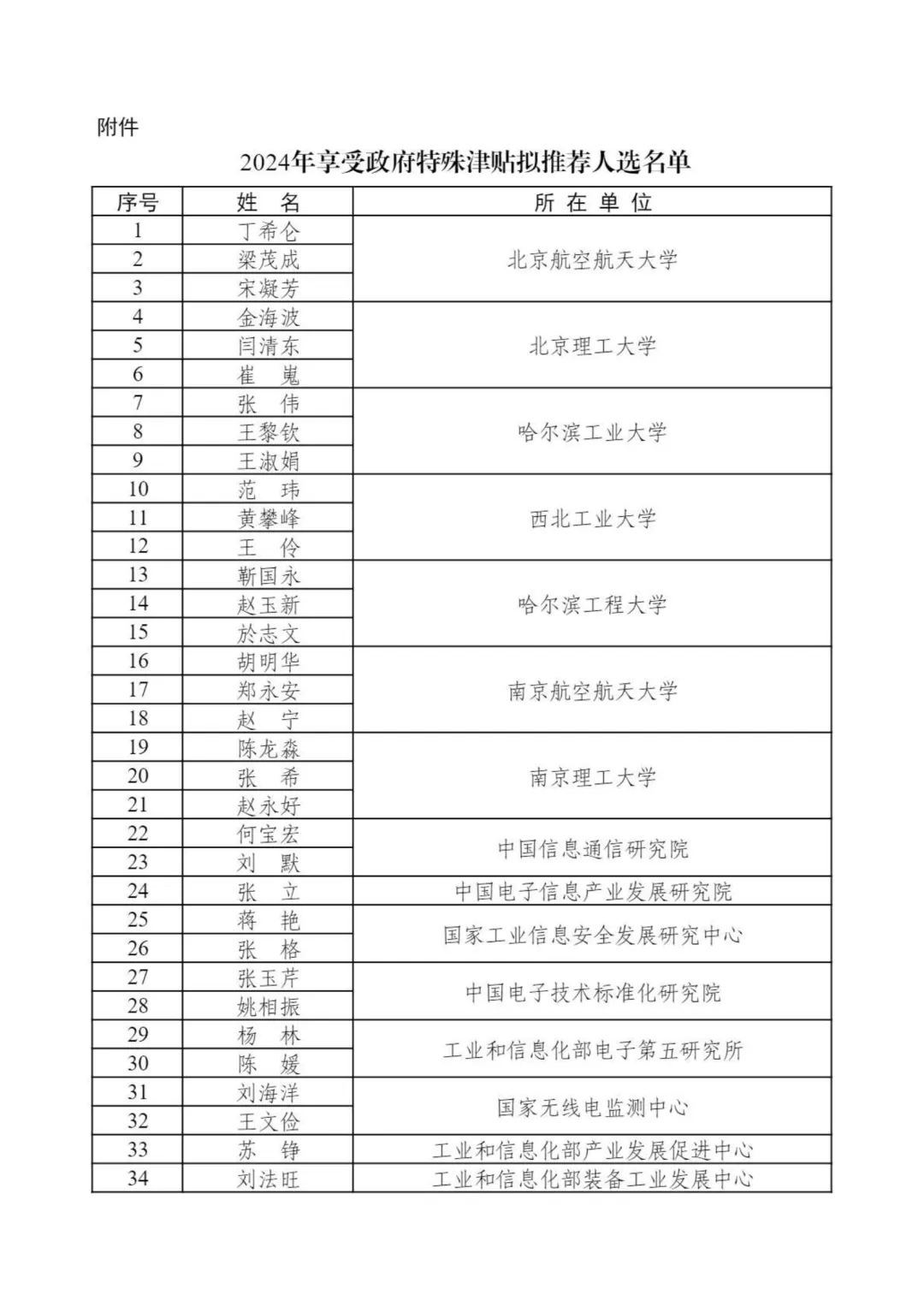 工业和信息化部2024年享受政府特殊津贴推荐人选名单