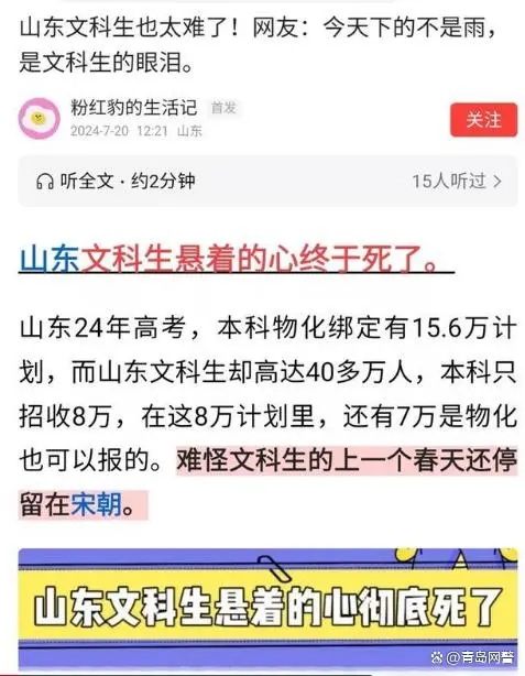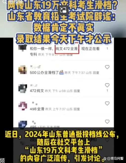 近日,2024年山东普通批投档线公布。随后在社交平台上“山东19万文科考生滑档”的内容广泛流传,引发讨论。