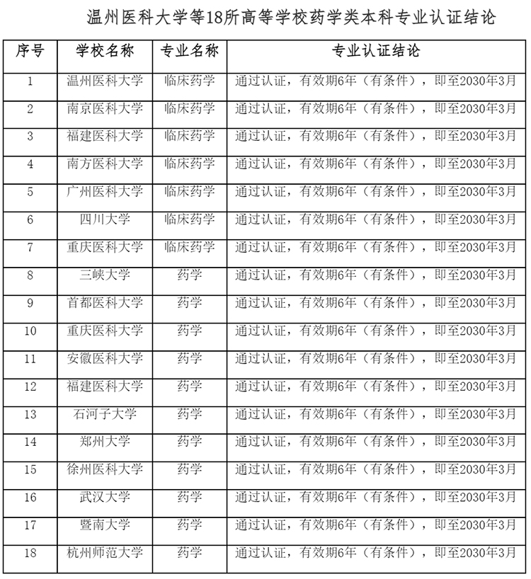 关于温州医科大学等18所高等学校药学类本科专业认证结论的公示