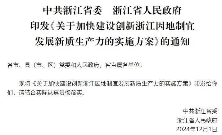 1月10日,浙江省委省政府印发《关于加快建设创新浙江因地制宜发展新质生产力的实施方案》。其中提到,到2027年,教育强省建设取得突破性进展。浙江大学基本建成世界一流大学并争先进位,10所以上高等职业学校进入全国一流行列,国家学前教育普及普惠县、义务教育优质均衡发展县建成比例分别达95%和75%。