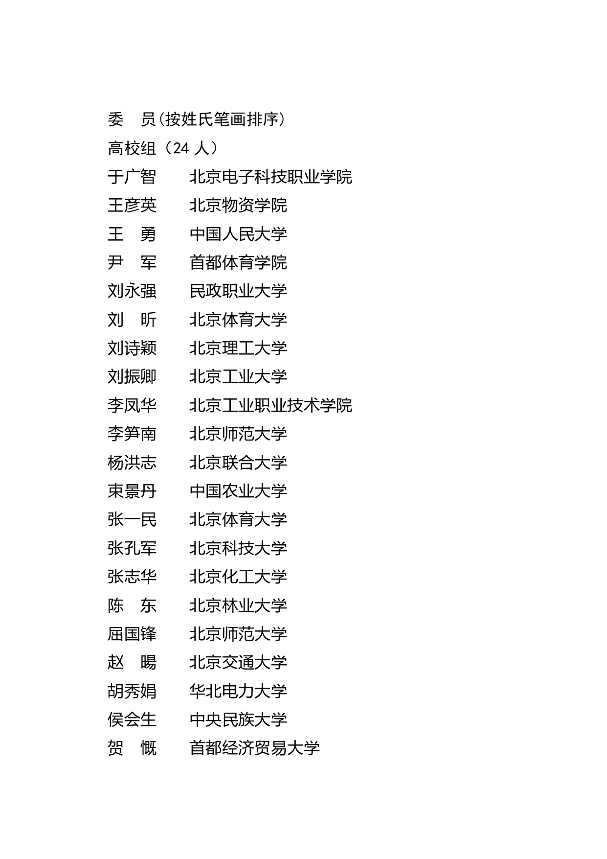 首届北京学校体育教学指导委员会有委员63人,包括主任委员1人、副主任委员6人、秘书长1人、副秘书长4人、委员51人。委员聘期4年,自2025年1月起至2028年12月止。委员会分为高校组和基教组,按照专业领域分为理论研究、教育教学、赛事活动三个方向。教指委秘书处设在首都体育学院。