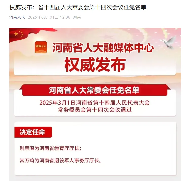 据“河南人大”消息,2025年3月1日,河南省第十四届人民代表大会常务委员会第十四次会议通过,决定任命别荣海为河南省教育厅厅长,决定免去毛杰的河南省教育厅厅长职务。