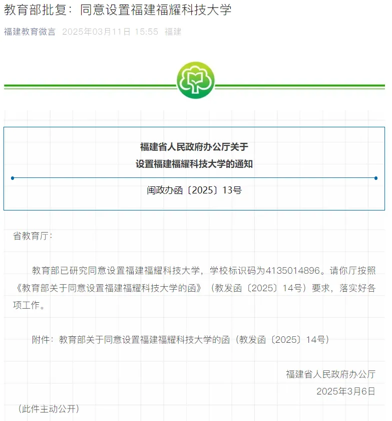 通知明确,福建福耀科技大学为民办普通本科学校,定位为新型研究型大学,紧紧围绕国家战略和经济社会发展需要,突出理工和科技,着重开展制造业科技创新研究,培养拔尖创新人才,由福建省领导和管理。
