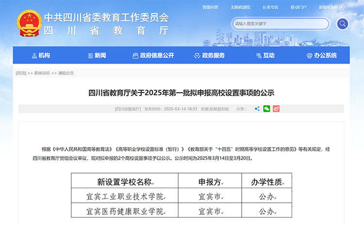 近日,四川省教育厅发布关于2025年第一批拟申报高校设置事项的公示,拟设立宜宾工业职业技术学院、宜宾医药健康职业学院。公示信息显示,两所学校的办学性质均为公办 ,申报方为宜宾市。