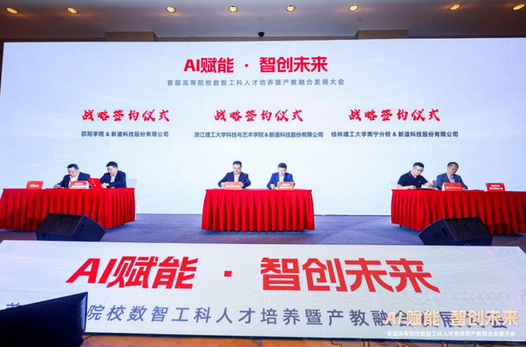 4月11日,首届高等院校数智工科人才培养暨产教融合发展大会在长沙举行。大会以“AI赋能 智创未来”为主题,来自全国各地的本科院校、职业院校、行业企业以及媒体等1000余位嘉宾共聚长沙,共探人工智能驱动下新工科教育数智化转型的创新实践,共享产教协同育人新成果,校企聚力构建数智工科教育新生态。会上,新道科技与中国农业大学、无锡职业技术学院、邵阳学院等多家院校正式开启战略合作。