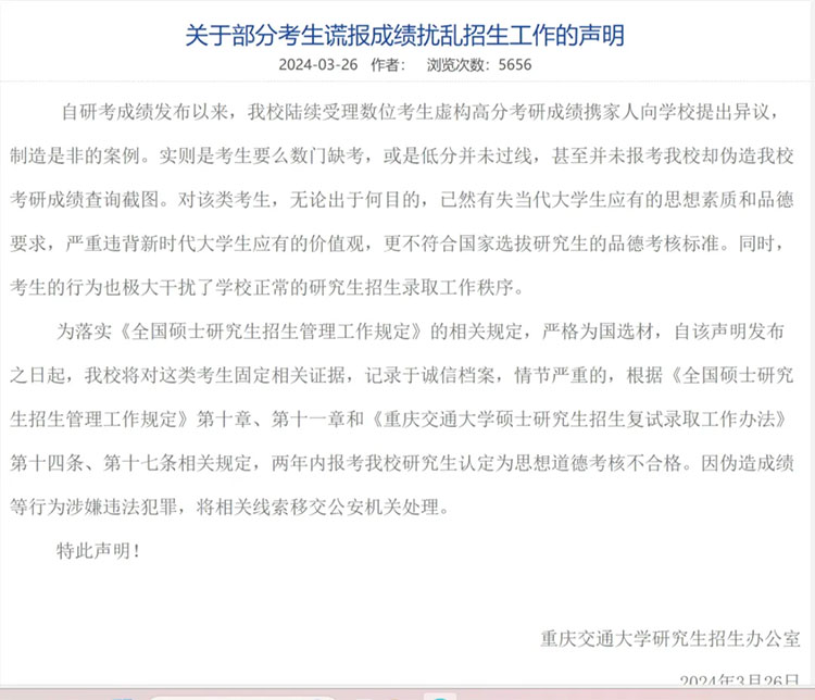日前,重庆交通大学发布了一条“关于部分学生谎报成绩扰乱招生工作的声明”,披露了当下一些考研学生荒唐的一幕: