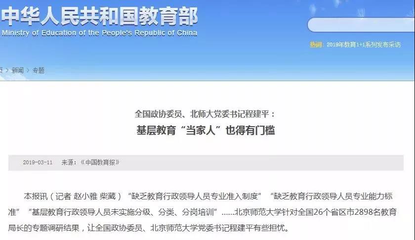 在2019年的全国两会上,全国政协委员、北京师范大学党委书记程建平看到了基层教育行政领导人员在专业化发展上的困境。