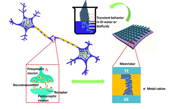 模仿人脑神经网络的类脑神经形态器件可构建高智能、低功耗类脑芯片。有记忆功能的非线性电阻-忆阻器,能够用来模拟生物突触和神经元的信息处理功能,是实现人工神经网络的理想选择。另一方面,物理瞬态电子是指电子器件或者系统在完成它的使命后可物理消失。将可随需消失的瞬态材料与忆阻器件结合起来,可实现神经网络的安全应用。例如,当信息安全受到威胁时,可以将瞬态芯片设备扔进水里,同时这样的设计还可以产生更环保的电子器件。近日,团队在该领域取得重要进展,成功设计了一种可溶于水的神经形态忆阻器件。