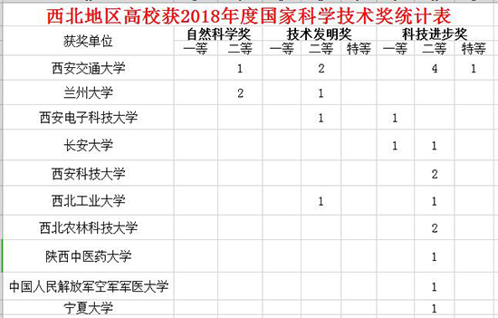 全国高等学校获得2018年国家科学技术进步奖通用项目119项(一等奖10项,创新团队奖3项,二等奖106项),占通用项目授奖总数137项(一等奖11项,创新团队奖3项,二等奖123项)的86.9%。其中,西北地区10所院校共获国家科学技术进步奖特等奖1项,一等奖2项,二等奖13项。