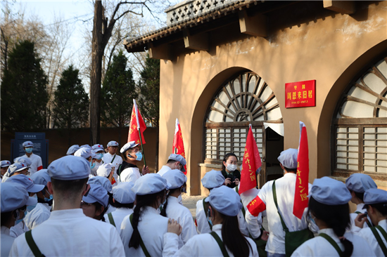 在枣园革命旧址“五大书记”铜像前,同学们以景仰的目光仔细端详,思绪中是闪光的“延安精神”,是中国共产党不懈奋斗团结带领全国人民把中国革命引向胜利的壮丽篇章。