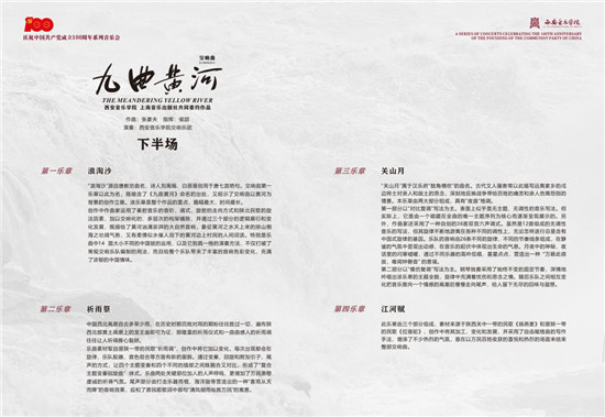 《九曲黄河》交响曲音乐会是西安音乐学院庆祝中国共产党成立100周年系列大型主题艺术实践活动之一,也是学校和上海音乐出版社共同委约的重要音乐作品展演。整场音乐会分为上、下两个半场。