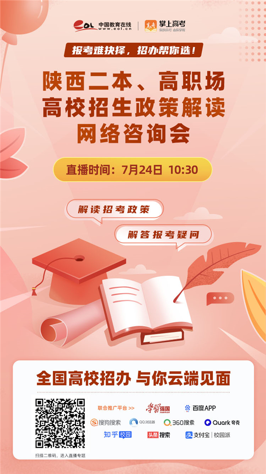 金宝搏188入口 将于7月24日举办“2021年陕西本科二批、高职场高校招生政策解读网络咨询会”。学校招生负责人做客直播间,亲自为你剖析最新招考政策和各类报考热点问题,让你选科、选专业、学业生涯规划不迷茫!