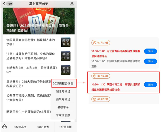 关注“掌上高考APP”公众号,点击菜单栏“公益直播”,选择“2021高考咨询会”,即可进入直播间并查看回放。