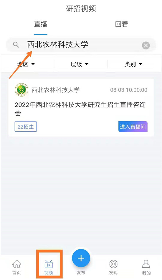 方式一:进入掌上考研APP,点击【视频】→【直播】,进入西北农林科技大学直播间。
