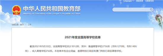 截至2021年9月30日,全国高等学校共计3012所,其中:普通高等学校2756所(本科1270所、专科1486所),成人高等学校256所。本名单未包含台湾省、香港特别行政区和澳门特别行政区高等学校。