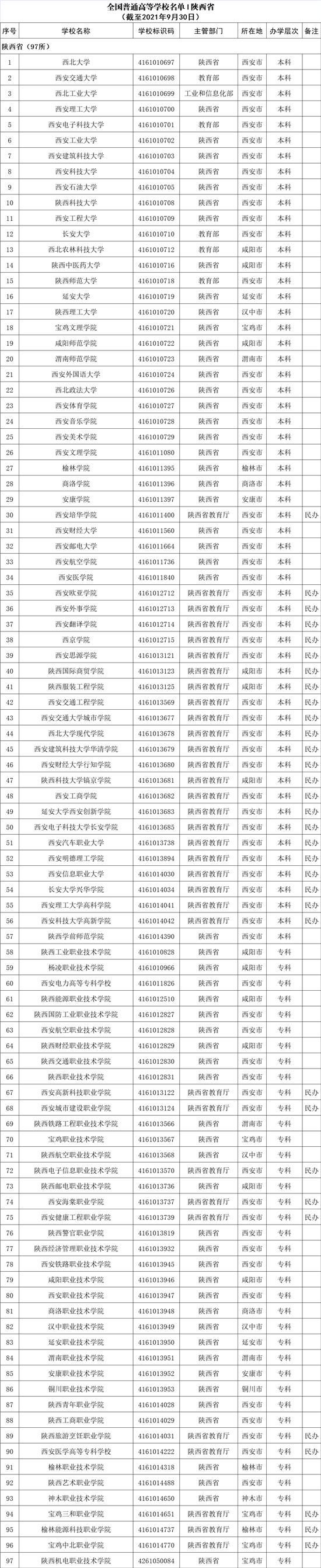 发布全国最新高校名单,陕西97所,较去年增加1所